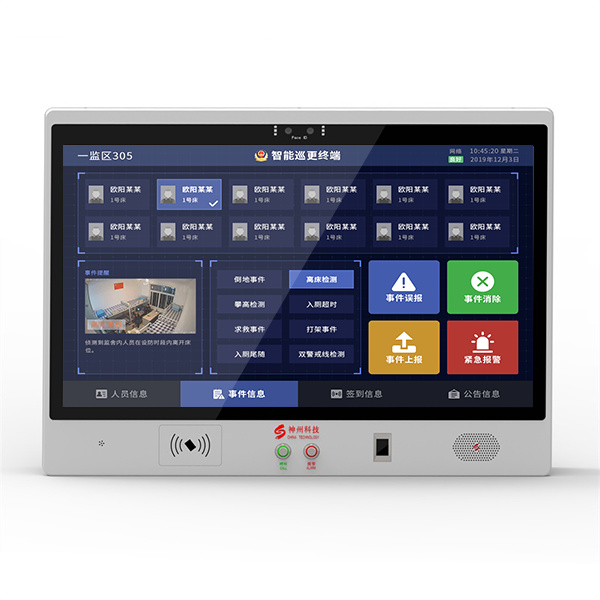 神州室外信息交互終端采用13.3/15.6/21.5寸電容式多點(diǎn)觸摸屏,基于完全自主可控的旗艦級(jí)國(guó)產(chǎn)芯片處理器,采用6核心超高性能CPU,GPU采用四核ARM Mali-T860MP4高性能圖像處理器,壁掛、內(nèi)嵌安裝在每個(gè)監(jiān)倉(cāng)門(mén)口外的墻壁上;每個(gè)監(jiān)倉(cāng)配置一臺(tái),可管理監(jiān)倉(cāng)分機(jī);可外接門(mén)燈、門(mén)磁、按鈕。內(nèi)置電源控制、可視對(duì)講、一鍵求助、情緒識(shí)別、監(jiān)舍點(diǎn)名、信息查詢(xún)、開(kāi)門(mén)申請(qǐng)、敏感詞監(jiān)測(cè)、門(mén)禁控制、值班巡查/違規(guī)查詢(xún)、提出/提入登記、考核排名等功能,定制化強(qiáng)可根據(jù)監(jiān)所實(shí)際管理流程定制開(kāi)發(fā)專(zhuān)項(xiàng)模塊功能。