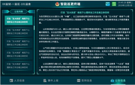 目前沒有明確的資料表明智慧監(jiān)舍的存在。但是有監(jiān)獄管理系統(tǒng)存在。 監(jiān)獄管理系統(tǒng)的功能: 1、對獄警進行考勤管理; 2、對罪犯出入獄時間及請假情況進行記錄; 3、對罪犯收發(fā)信件進行登記,并且可以查看其他罪犯寄出的信件; 4、對病號飯點、服刑人員探視時間等信息進行記錄; 5、對罪犯醫(yī)療