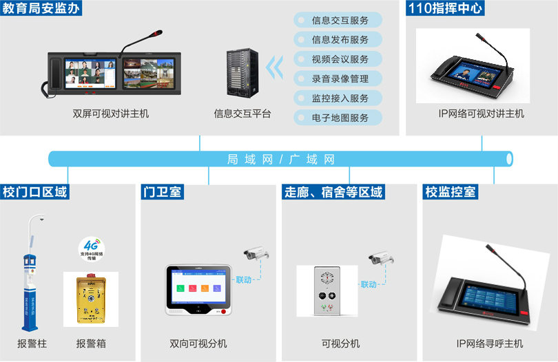神州學(xué)校一鍵報警可視對講系統(tǒng)基于IP網(wǎng)絡(luò)架構(gòu)(可跨網(wǎng)段跨路由),以高清音視頻編解碼技術(shù)為核心,構(gòu)建了一套功能完善、擴展性強、實時性高的聯(lián)網(wǎng)式音視頻實時交互平臺,實現(xiàn)教育局、110指揮中心對轄區(qū)內(nèi)校園突發(fā)事件的應(yīng)急響應(yīng)與遠程指揮。