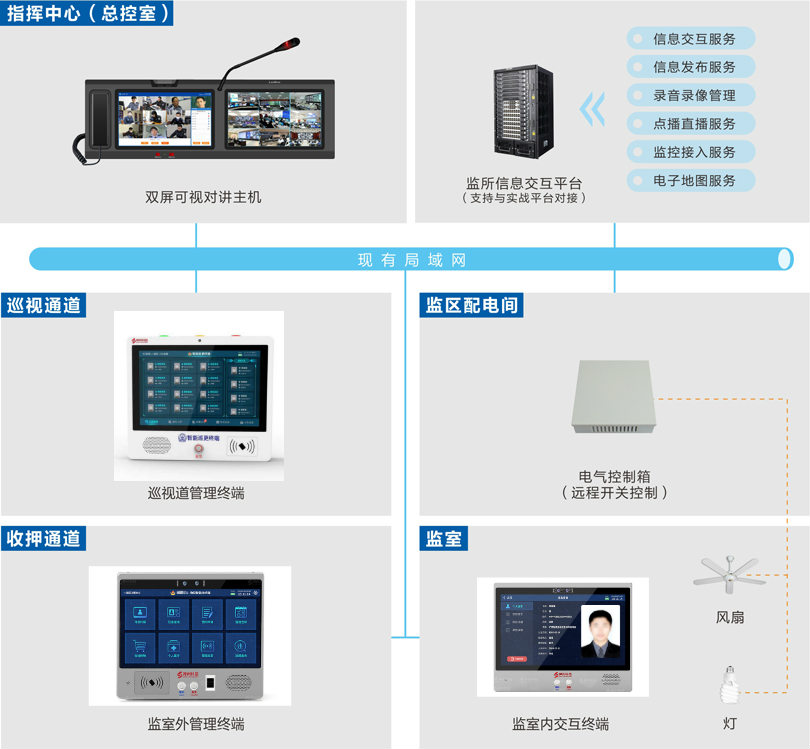 監(jiān)室智能終端也叫在押人員動(dòng)態(tài)信息系統(tǒng)民警窗口巡視終端(監(jiān)室民警業(yè)務(wù)終端),該系統(tǒng)包含管理服務(wù)器端應(yīng)用平臺(tái)軟件、民警巡視終端(也稱監(jiān)室觸摸查詢終端)和監(jiān)室交互式智能終端。系統(tǒng)功能信息豐富,便于與各省市監(jiān)管信息系統(tǒng)(違法犯罪信息系統(tǒng))數(shù)據(jù)庫關(guān)聯(lián),實(shí)現(xiàn)在押人員信息數(shù)據(jù)一次錄入。