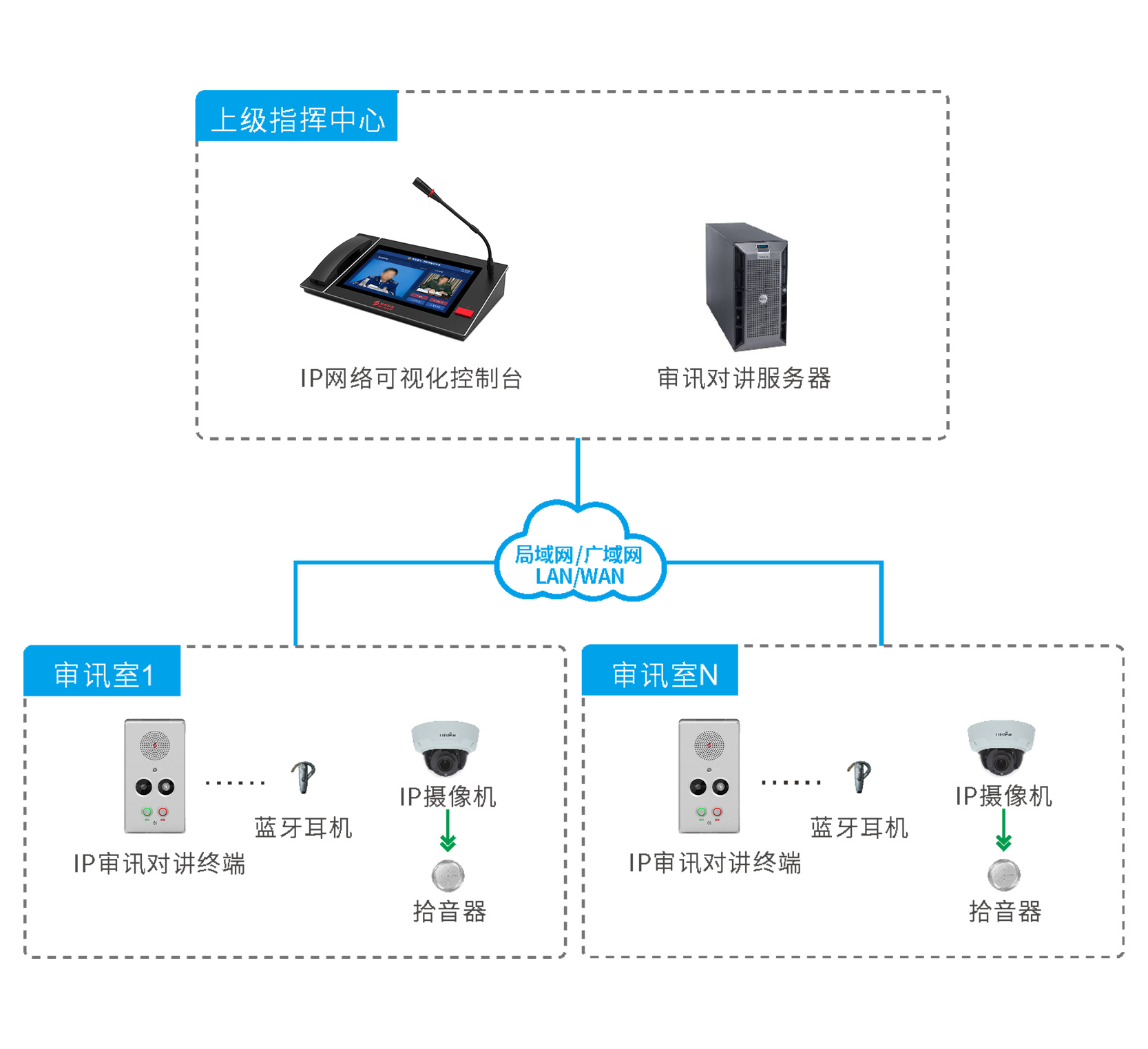 神州審訊對(duì)講系統(tǒng)?基于IP網(wǎng)絡(luò)音視頻通訊技術(shù),可通過(guò)藍(lán)牙耳機(jī)接收遠(yuǎn)程語(yǔ)音指令,可通過(guò)分機(jī)一鍵報(bào)警到監(jiān)控室主機(jī)進(jìn)行可視對(duì)講。系統(tǒng)采用神州自主知識(shí)產(chǎn)權(quán)的數(shù)字音視頻技術(shù),徹底解決了網(wǎng)絡(luò)對(duì)講時(shí)的回音、嘯叫。視頻采用H.264,廣播采用MP3、通話采用32K音頻采樣。
