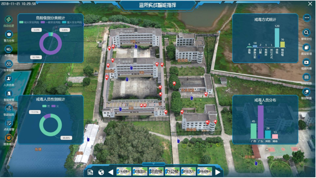 智慧監(jiān)所綜合管控平臺基于現(xiàn)有平臺進行升級、原有800路視頻點位授權遷移,新平臺軟件支持將戒毒所現(xiàn)有平臺軟件內的設備數據全部導出并無縫轉移至新平臺內,完成全部設備信息的遷移,不影響存儲、報警、門禁等固有的規(guī)則設置,平臺升級后原有存儲錄像、報警事件路徑等維持不變,與戒毒管理局安防平臺互聯(lián)互通功能,實現(xiàn)視頻、報警、門禁、對講等各類信息的上傳和上級機關命令的接收執(zhí)行。