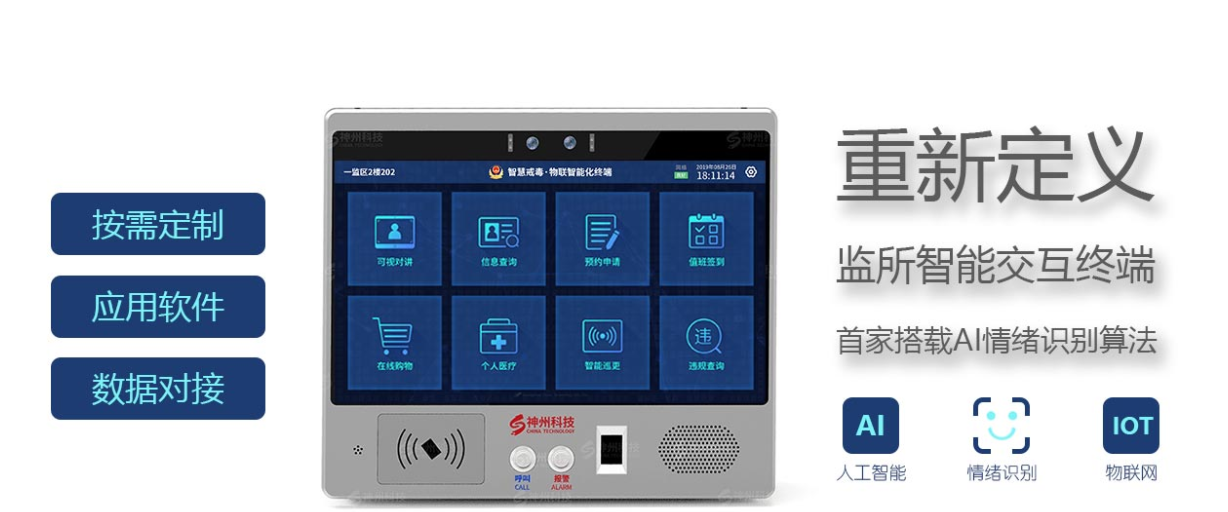 神州科技自主研發(fā)的監(jiān)倉(cāng)智能交互式終端采用硬質(zhì)鋁合金外殼,CNC加工;10.2英寸觸摸顯示屏,1080P高清視頻;嵌入式安裝在監(jiān)倉(cāng)內(nèi),具有雙鍵呼叫,可視對(duì)講,點(diǎn)播直播,在線購(gòu)物,值班簽到,心情記錄,身份識(shí)別等功能。